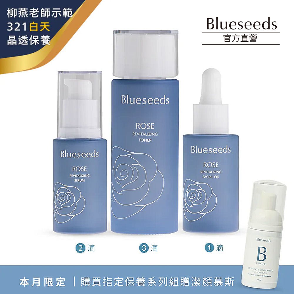 【Blueseeds】超值3入加贈洗顏慕斯★玫瑰精油露30ml+玫瑰精華液30ml+玫瑰化妝水100ml l 芙彤園活膚液精華液+精油露Blueseeds|芙彤園官方直營