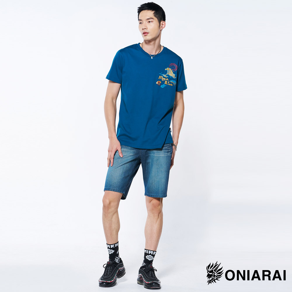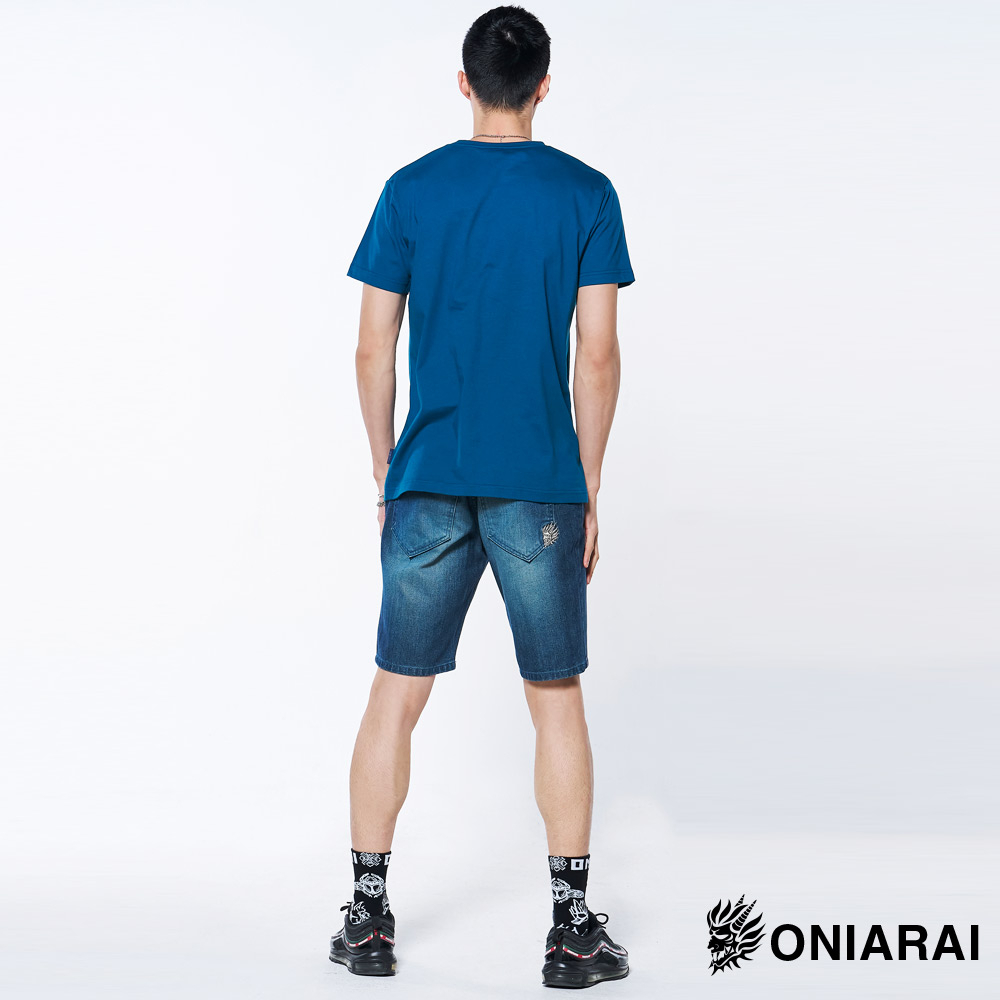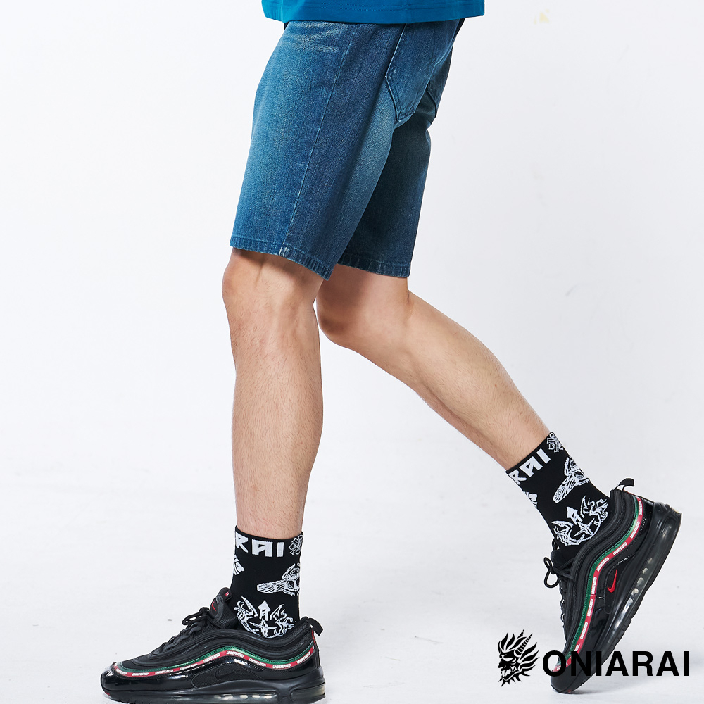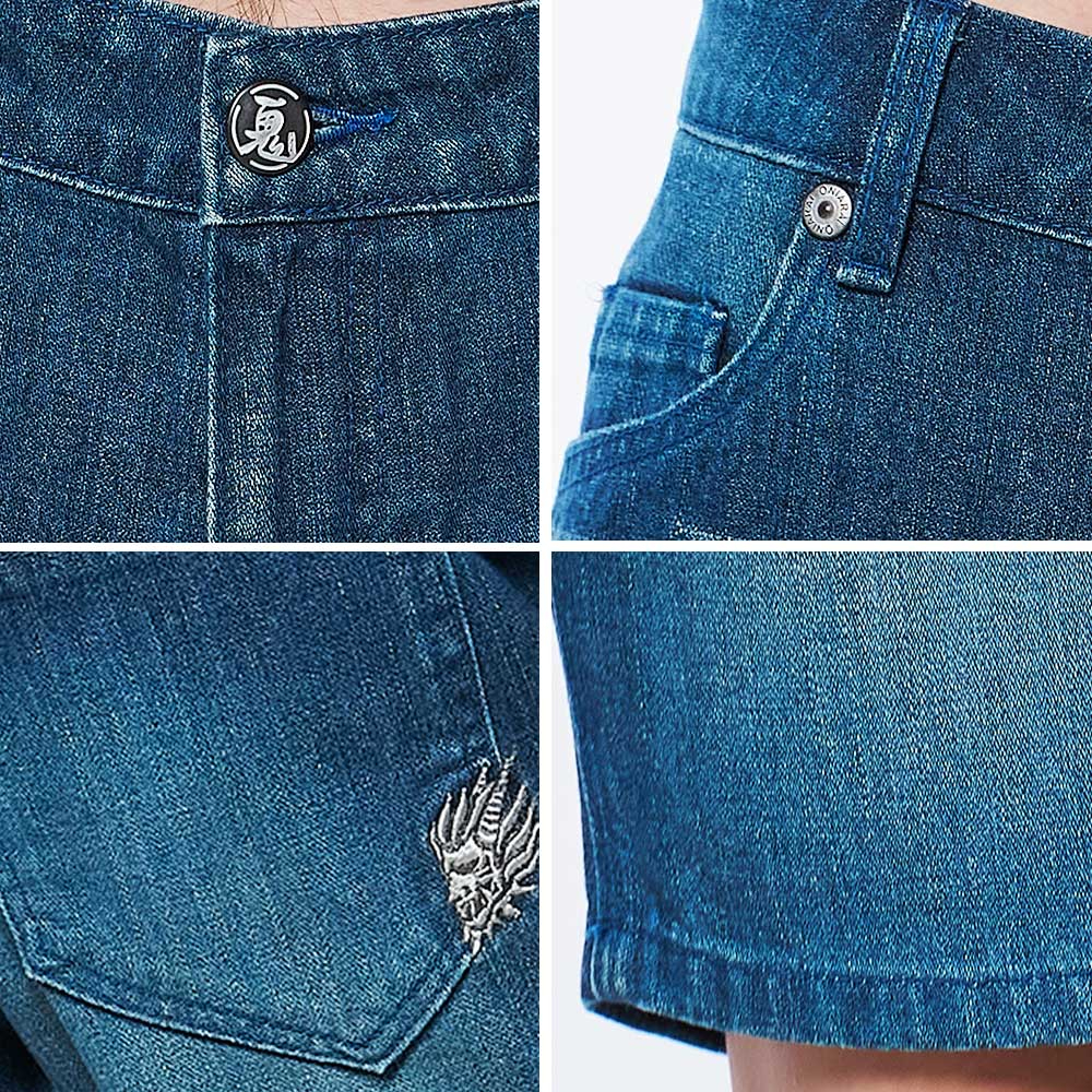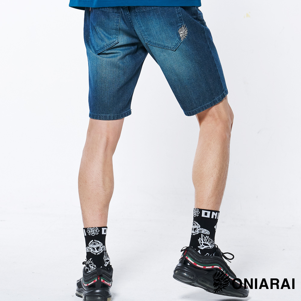 BLUE WAY 鬼洗 ONIARAI – 男款經典無彈小鬼頭繡花丹寧短褲(中藍)M|L|XL|3LBLUE WAY官方旗艦店