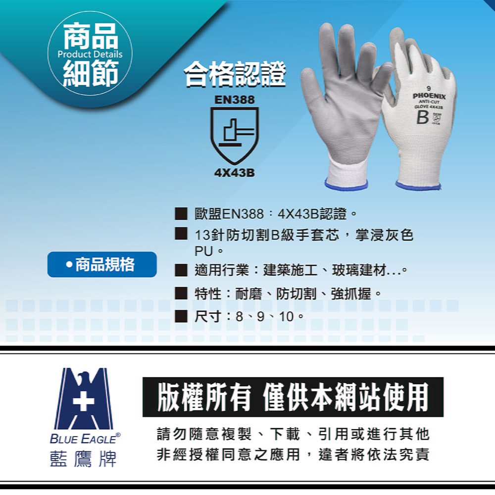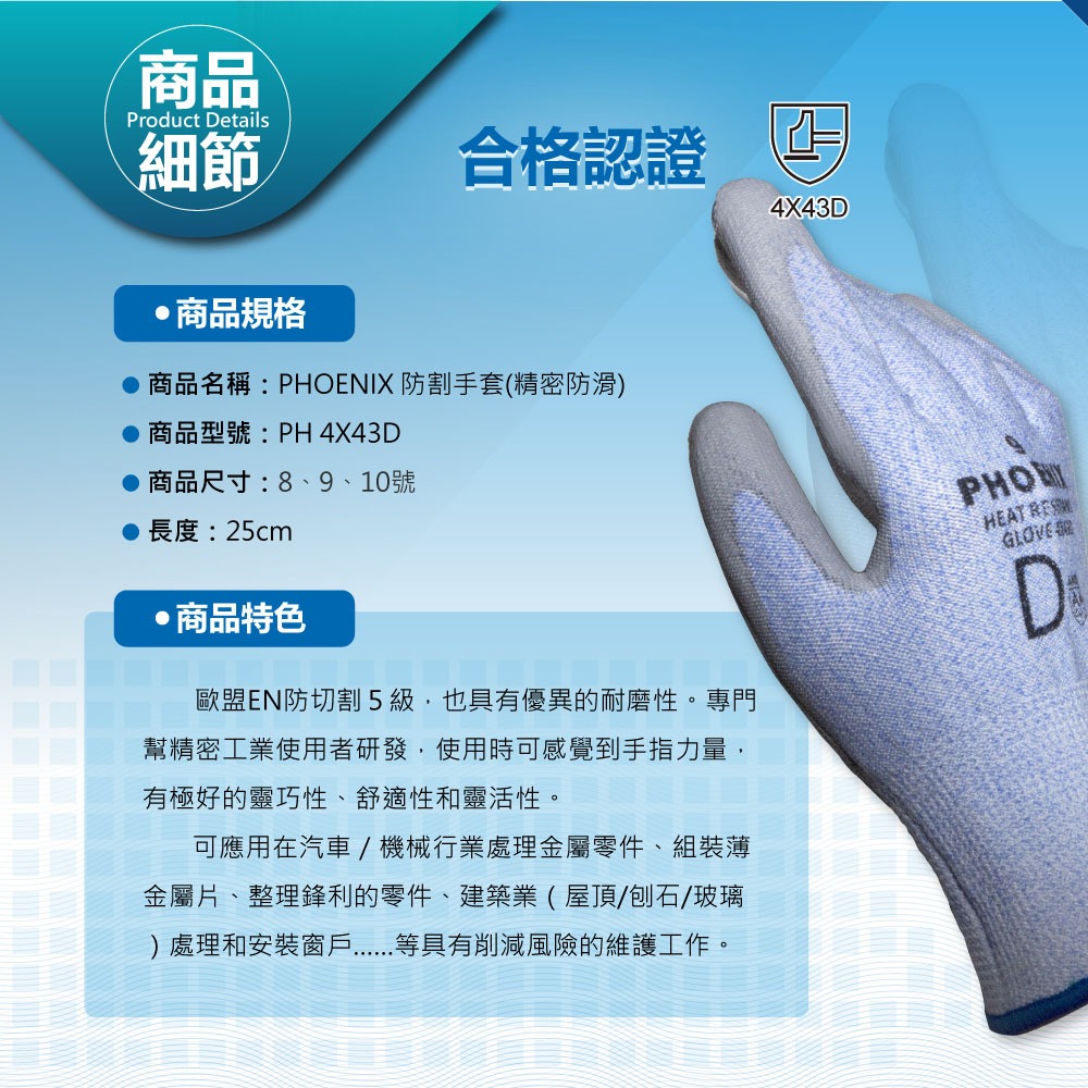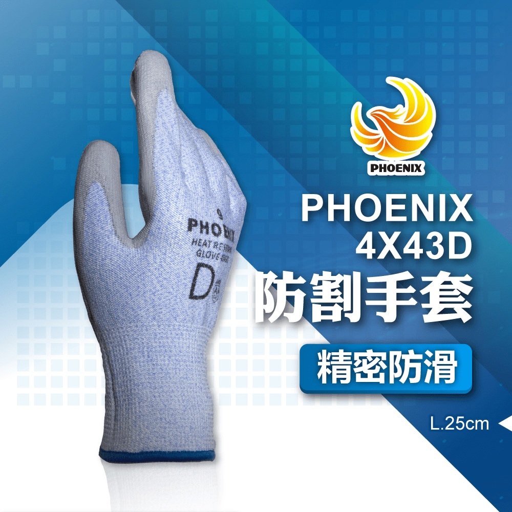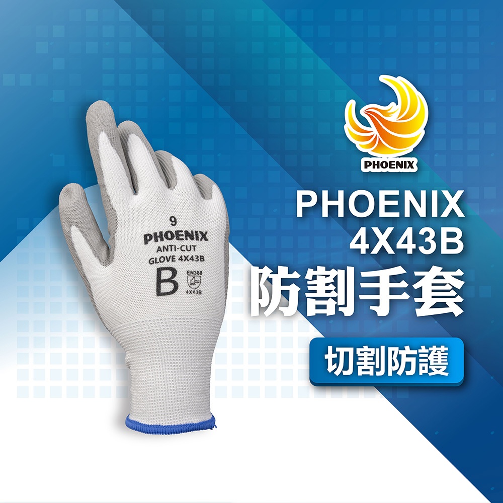 PHOENIX 菲尼斯 防割手套 工作手套 聚氨酯塗層高切割防護手套 防滑手套 歐盟EN388 手部護具 4X43B8號|9號|10號Protective Gloves, Goggles & MasksBlue Eagle 藍鷹牌專業口罩台灣總代理醫碩科技