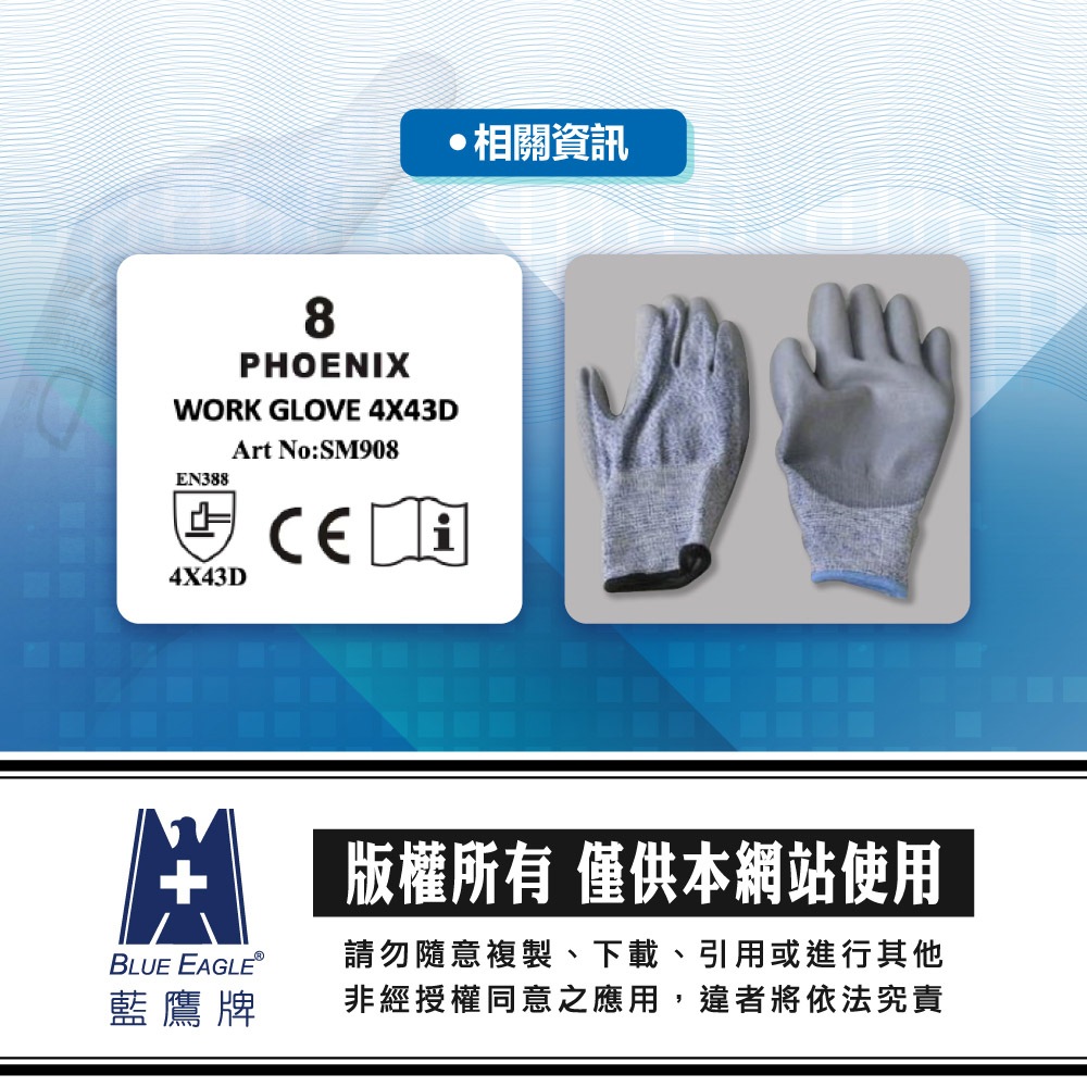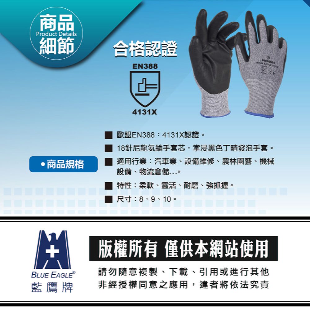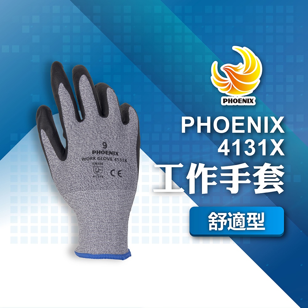 PHOENIX 菲尼斯 工作手套 舒適型 防割手套 防滑手套 搬家手套 歐盟EN388 手部護具 4131X8號|9號|10號Protective Gloves, Goggles & MasksBlue Eagle 藍鷹牌專業口罩台灣總代理醫碩科技