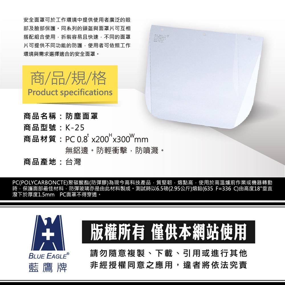 藍鷹牌 防熱面罩 K-25 防輕衝擊防噴濺 可選搭K-4頭盔 簡易型工作防風防塵透明面罩頭盔組K-4頭盔+K-25防塵面罩|K-25防塵面罩(不含頭盔)Protective Gloves, Goggles & MasksBlue Eagle 藍鷹牌專業口罩台灣總代理醫碩科技