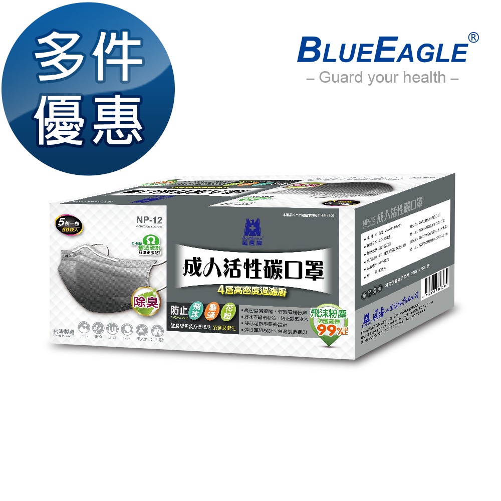 藍鷹牌 台灣製 成人活性碳口罩 活性碳款 灰 50片x1盒 多件優惠中 NP-12藍鷹牌 台灣製 成人活性碳口罩 活性碳款 灰 50片x1盒 多件優惠中 NP-12MasksBlue Eagle 藍鷹牌專業口罩台灣總代理醫碩科技