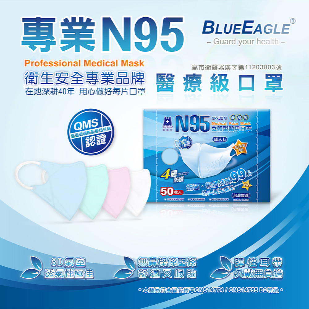 藍鷹牌 N95立體型成人醫用口罩 50片x1盒 多件優惠中 NP-3DM藍色|青色|粉色|白色Medical Gloves & MasksBlue Eagle 藍鷹牌專業口罩台灣總代理醫碩科技