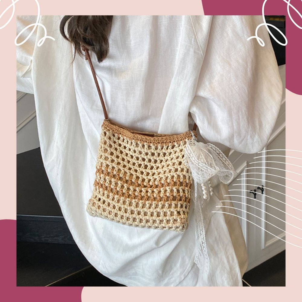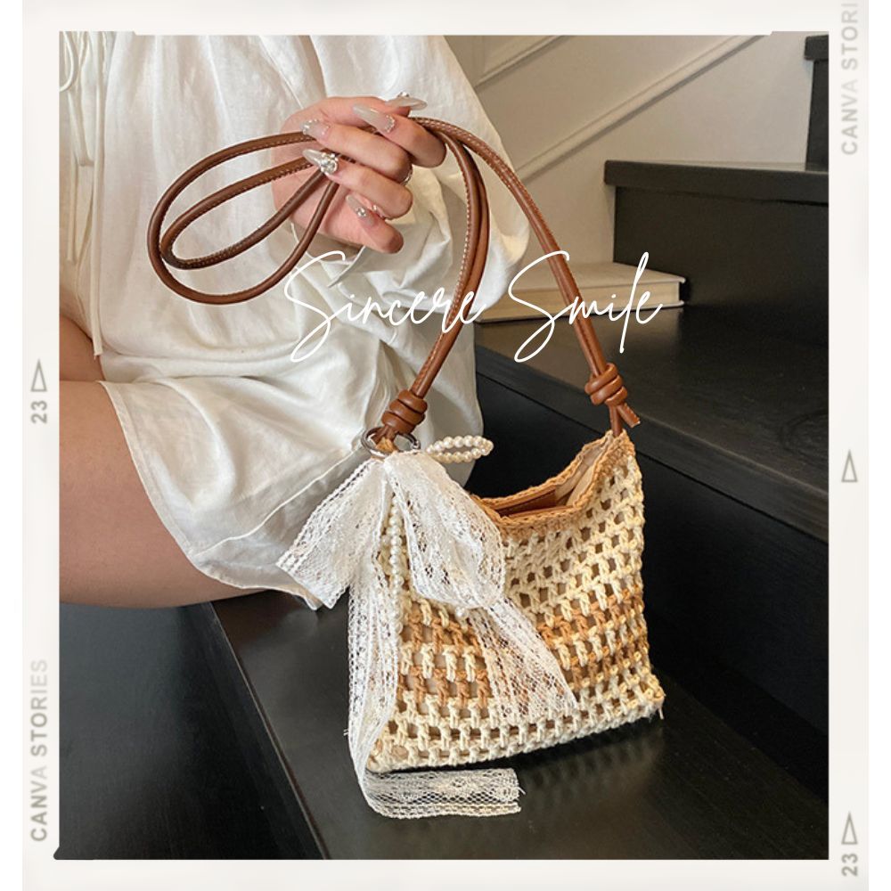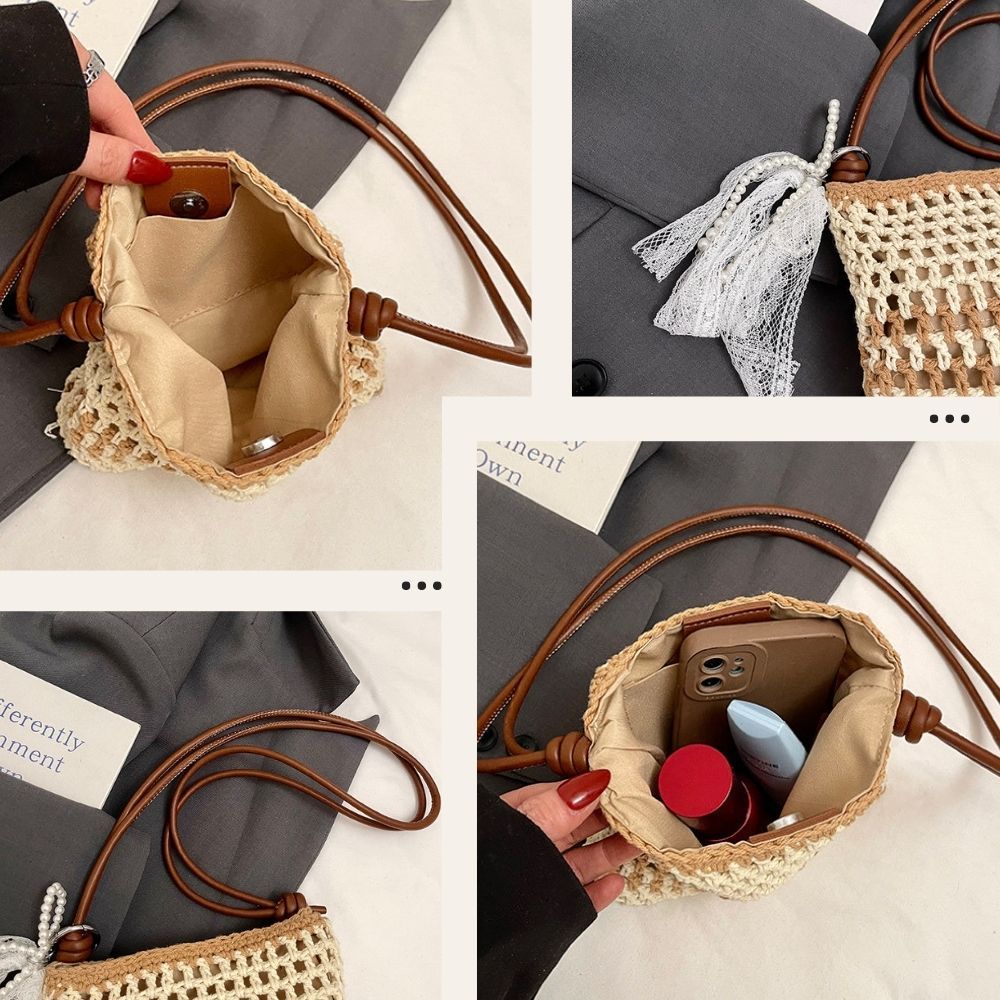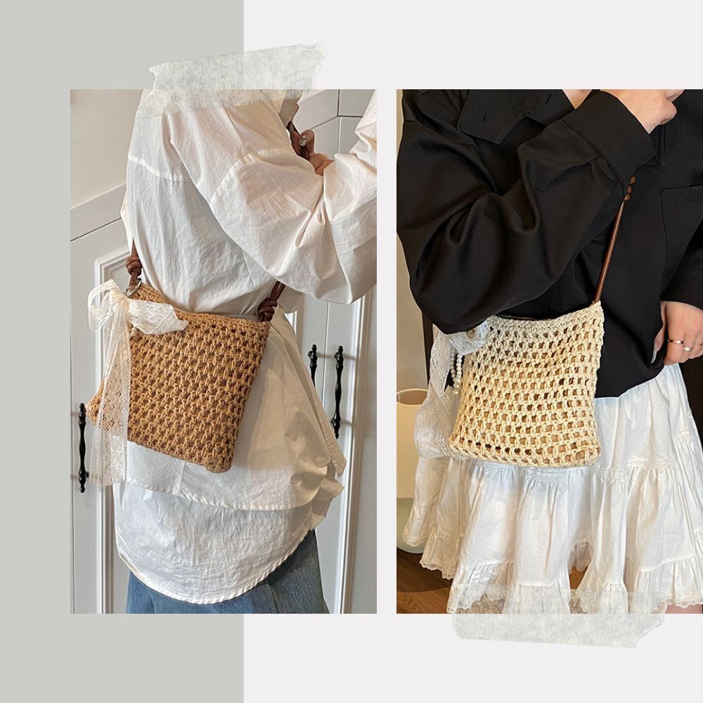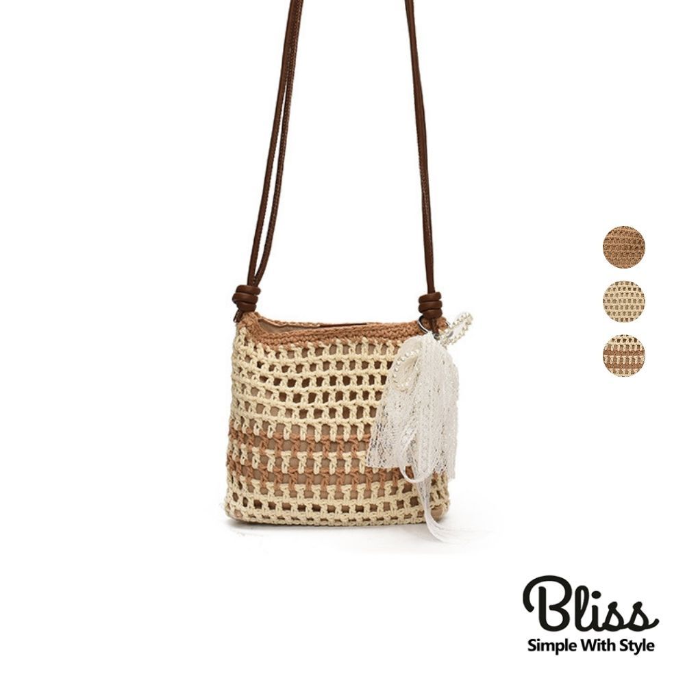 棉編蕾絲蝴蝶結珍珠手機包 斜跨包 斜背包 小廢包 2色可選拚色|咖色|米色Bliss ~ 各國流行包款 泰國原廠化妝保養品