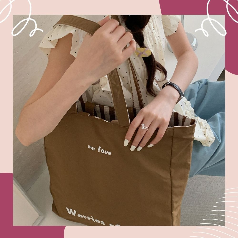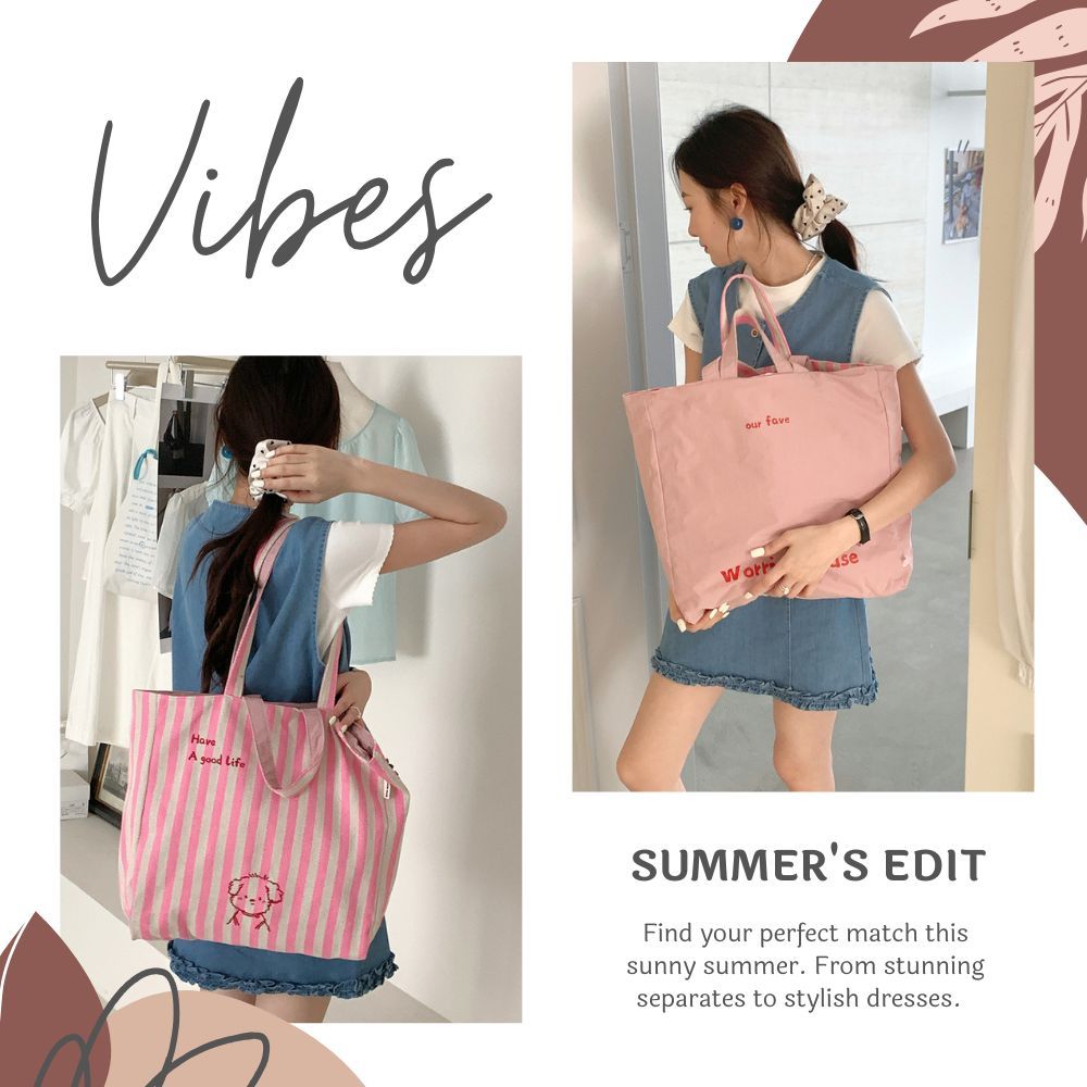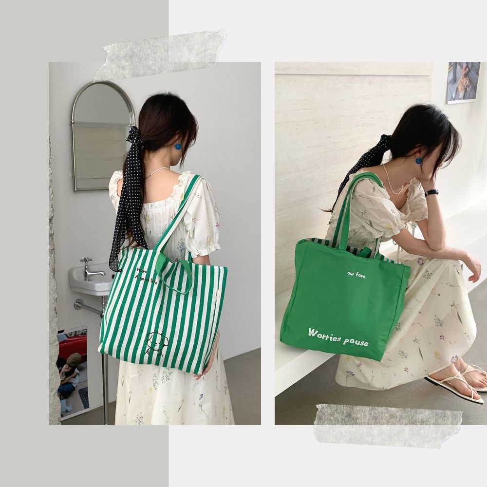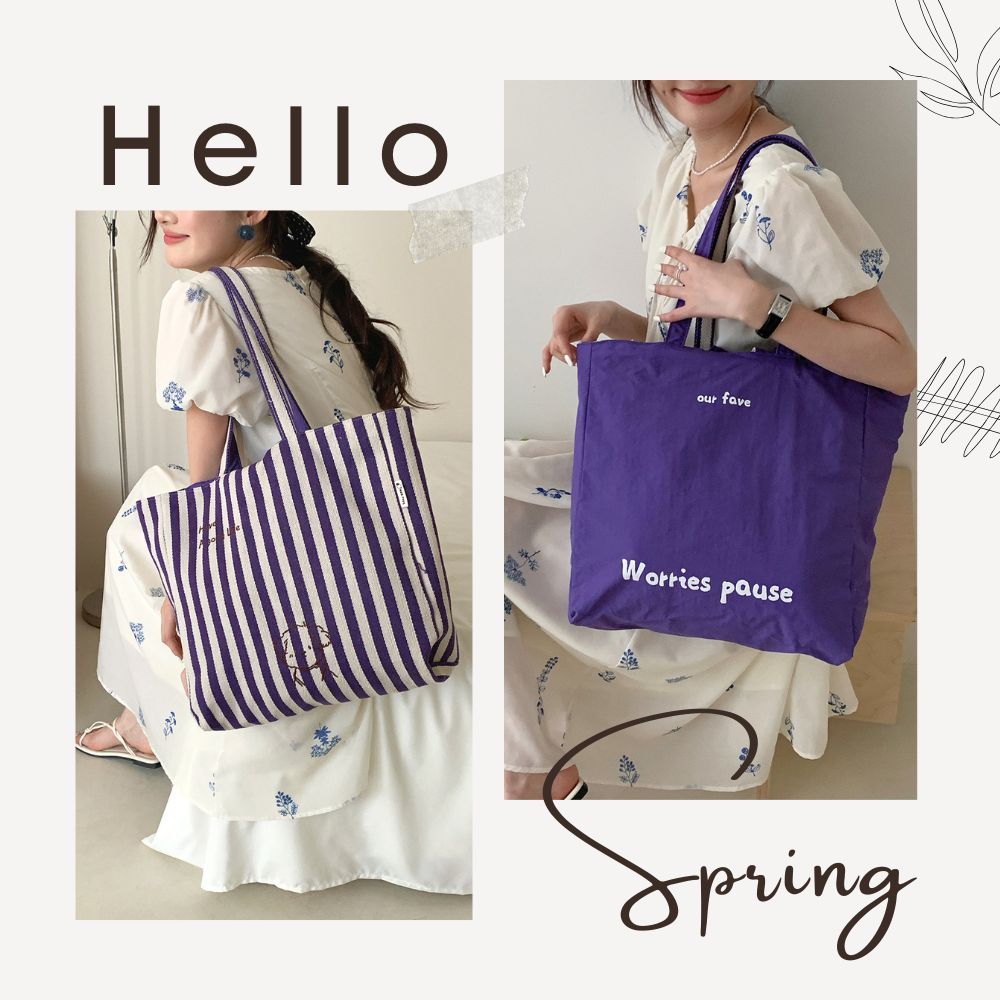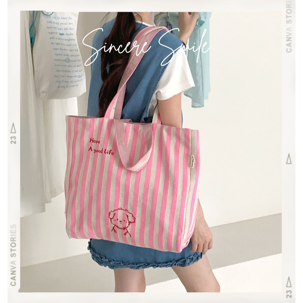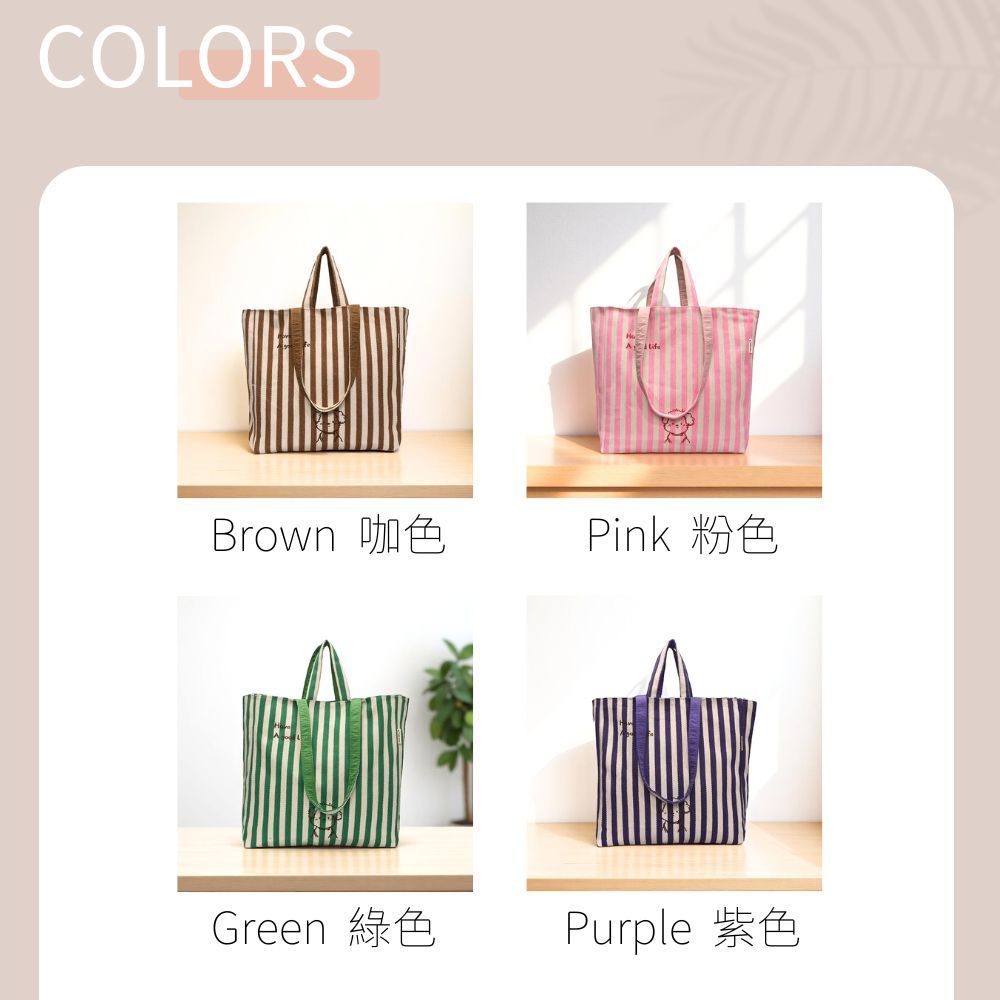 條紋小狗字母雙面拚購物包 肩背包 帆布包 側背包 購物袋 4色可選咖色|粉色|綠色|紫色Bliss ~ 各國流行包款 泰國原廠化妝保養品