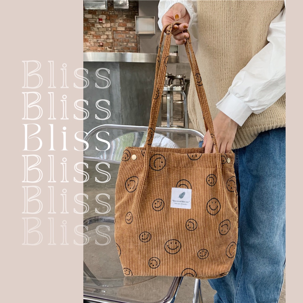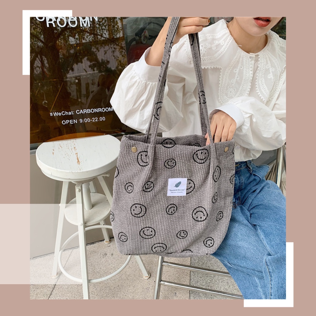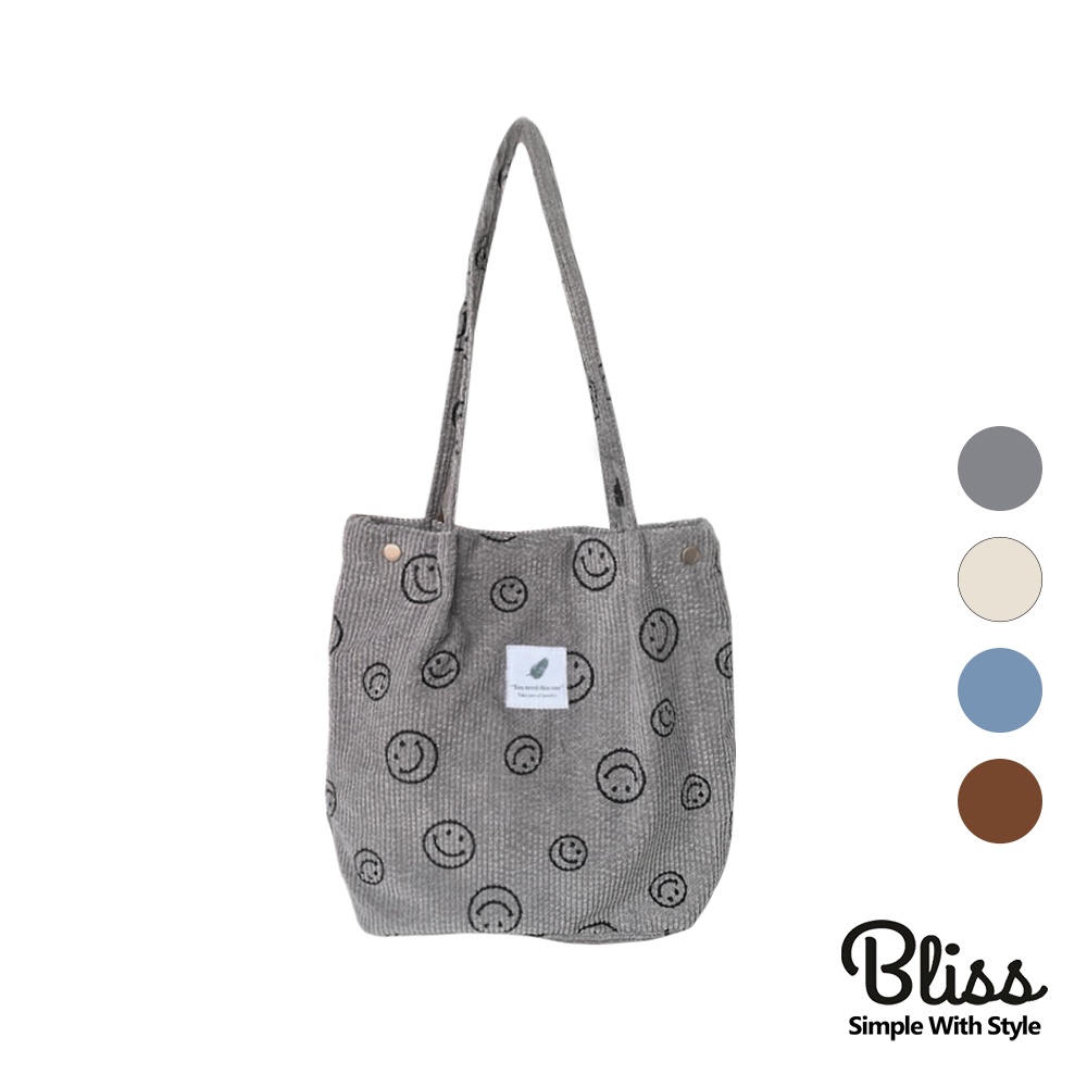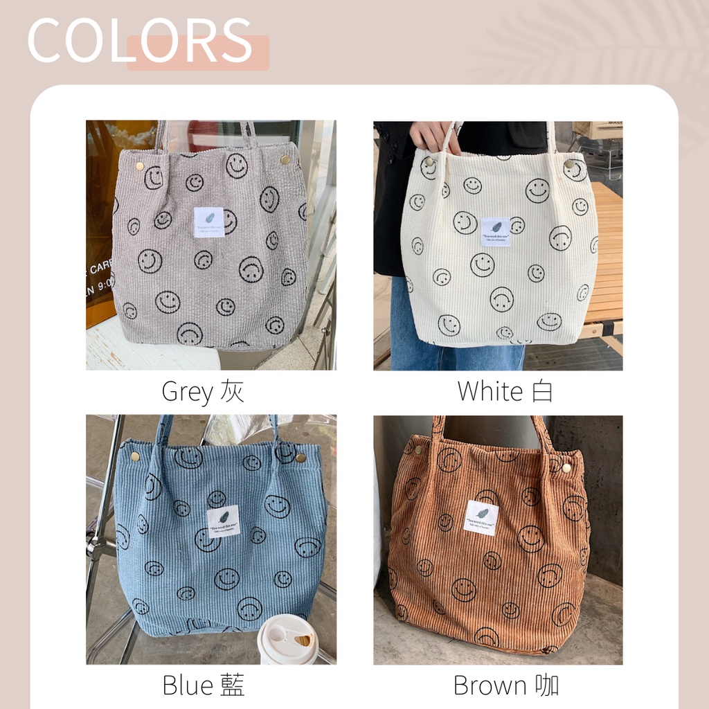 微笑燈芯絨單肩包 肩背包 側背包 托特包 購物袋 笑臉 台灣現貨 大容量 4色可選 可放A4灰色|米白|藍色|咖色Bliss ~ 各國流行包款 泰國原廠化妝保養品