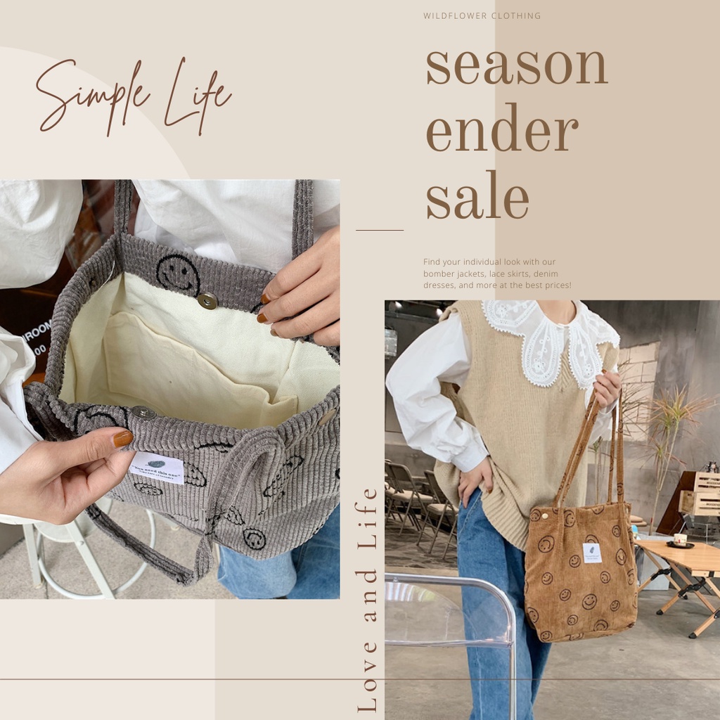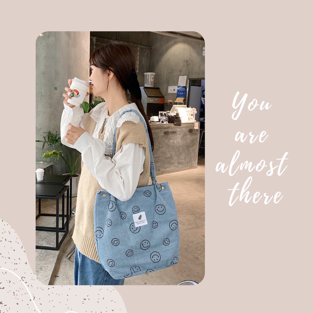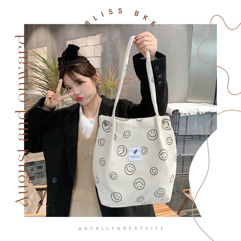 微笑燈芯絨單肩包 肩背包 側背包 托特包 購物袋 笑臉 台灣現貨 大容量 4色可選 可放A4灰色|米白|藍色|咖色Bliss ~ 各國流行包款 泰國原廠化妝保養品