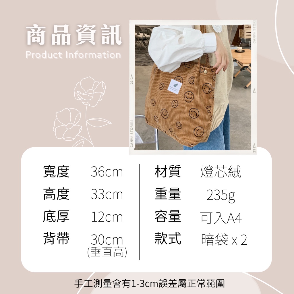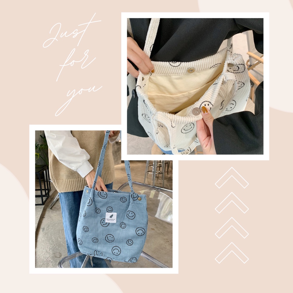 微笑燈芯絨單肩包 肩背包 側背包 托特包 購物袋 笑臉 台灣現貨 大容量 4色可選 可放A4