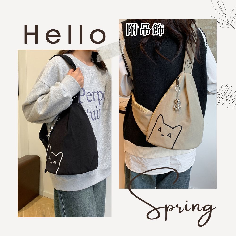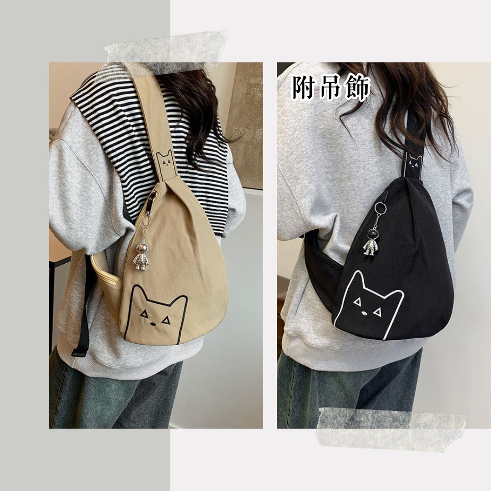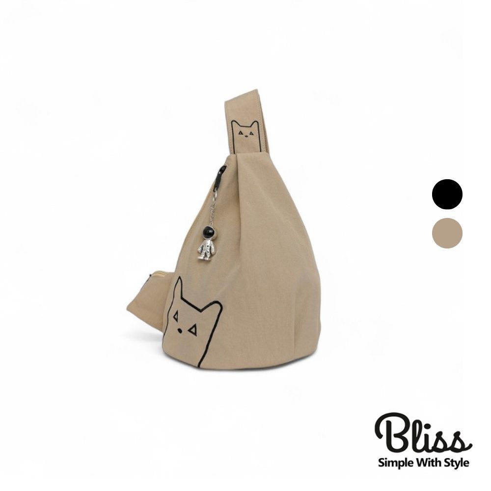 簡約刺繡線條貓咪側背袋 肩背包 手提包 斜背包 側背包 胸包 2色黑色|卡其Bliss ~ 各國流行包款 泰國原廠化妝保養品