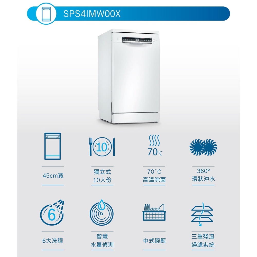 BOSCH 博世 SPS4IMW00X 10人份 45公分寬 獨立式洗碗機【限量福利品】箱損福利品-不含安裝|箱損福利品-含基本安裝DishwashersBOSCH家電官方旗艦店