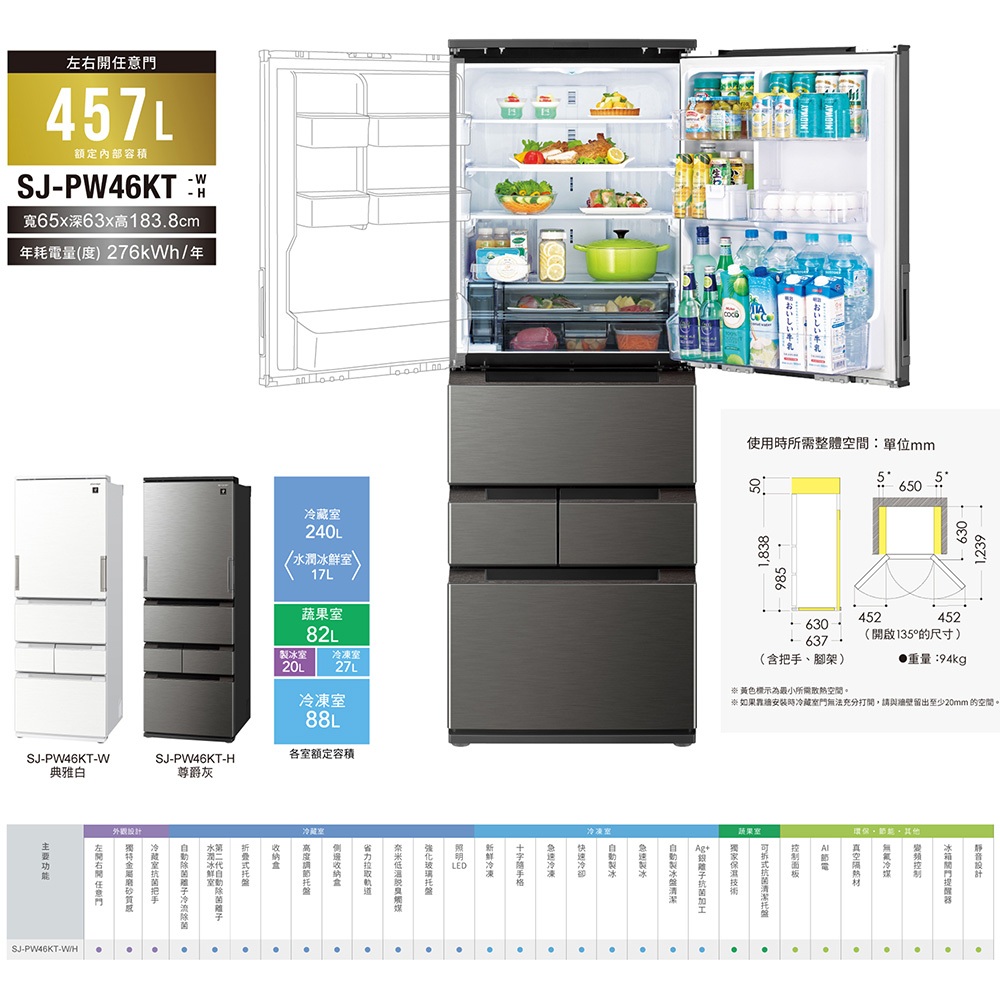 【SHARP夏普】自動除菌離子左右開任意門變頻冰箱 SJ-PW46KT-W 457L 典雅白 加贈不鏽鋼刀具砧板七件組限時特賣 SJ-PW46KT-W|SJ-PW46KT-WRefrigerators SHARP 夏普旗艦館