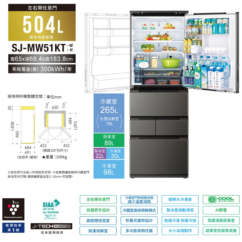 【SHARP夏普】 自動除菌離子左右開任意門變頻冰箱 SJ-MW51KT-W 504L 典雅白限時特賣 SJ-MW51KT-W|SJ-MW51KT-WRefrigerators SHARP 夏普旗艦館