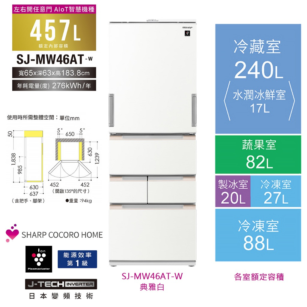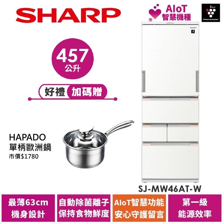 【SHARP夏普】AIoT智慧任意門除菌變頻冰箱 SJ-MW46AT-W 457L 典雅白 加碼贈品單柄歐洲鍋限時特賣SJ-MW46AT-W|SJ-MW46AT-WRefrigerators SHARP 夏普旗艦館