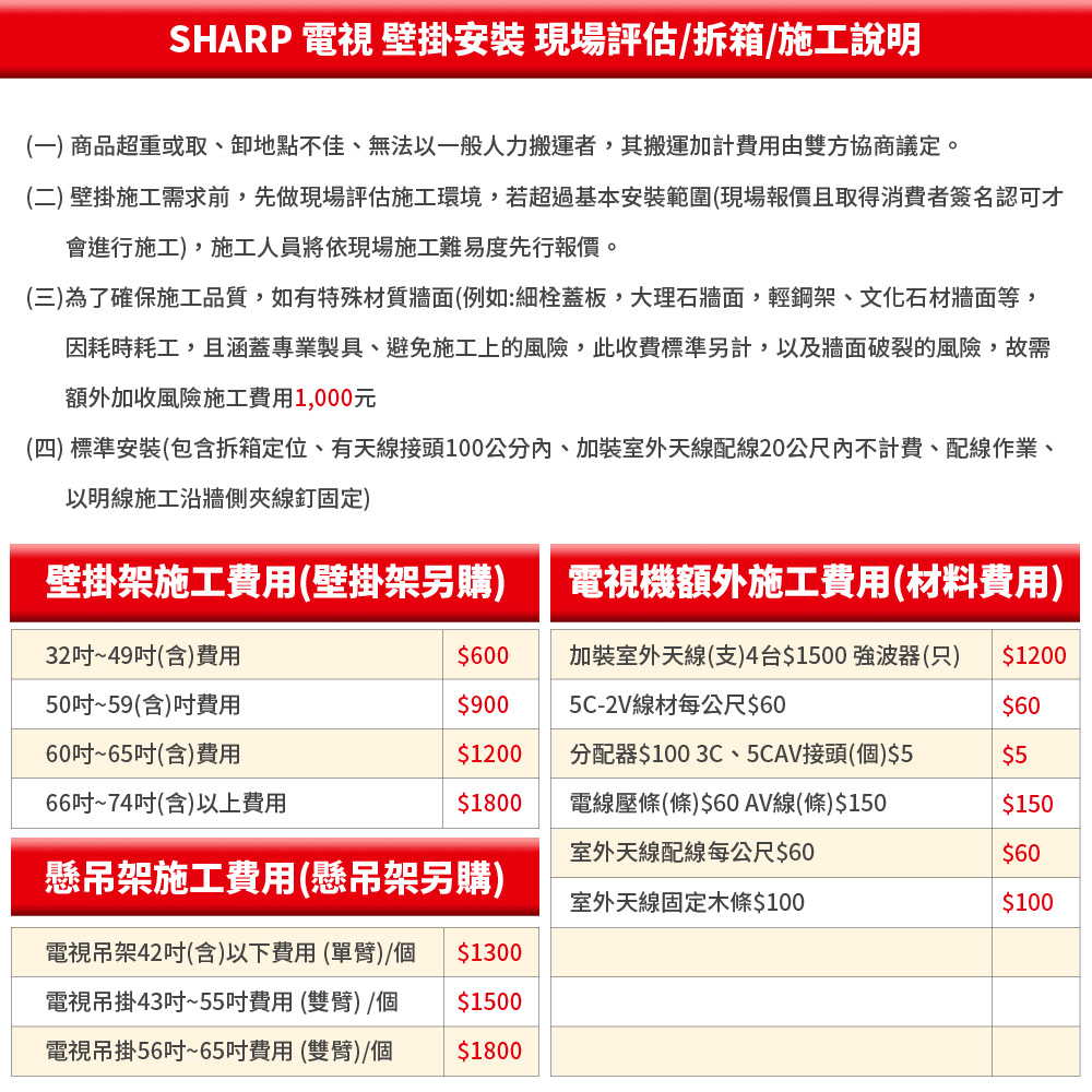 電視壁掛架(此部份只有販售商品, 不包含施工費用)P4(32-47吋適用)旋臂架|NBP6(45~75吋適用)旋臂架|ITW-03 壁掛架(40-65吋適用)|ITW-05 壁掛架(55-10吋適用)|AW-05(55~90吋適用)壁掛架|ITW-02(32-55吋適用)壁掛架TV Brackets SHARP 夏普旗艦館