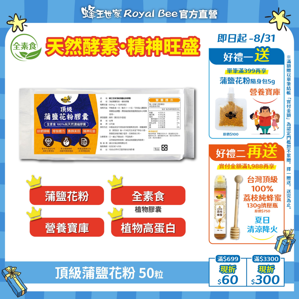 【蜂王世家】頂級蒲鹽花粉植物膠囊50粒鋁箔包/豐富B群/精神旺盛/養顔美容/全素食/送禮首選100粒盒裝/送禮佳品|超值300粒禮盒組/送禮自用兩相宜|50粒體驗鋁箔包/無盒Beauty Supplements Royal Bee 蜂王世家