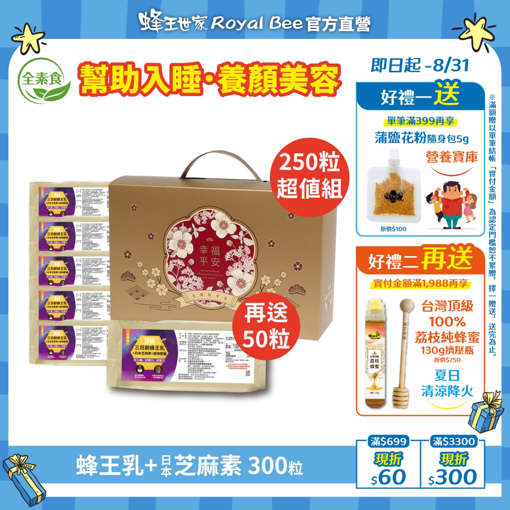 【蜂王世家】頂級三日齡蜂王乳+日本芝麻素(素食)膠囊回饋250粒+50粒囤貨組/最新效期2027/幫助入睡/送禮首選超值300粒禮盒裝/送禮自用|100粒盒裝/送禮佳品|5盒組/團購囤貨Beauty Supplements Royal Bee 蜂王世家